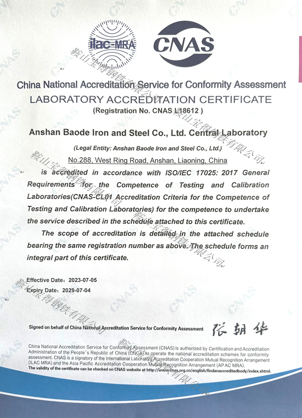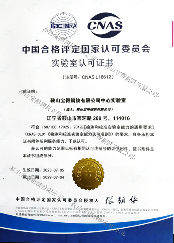 喜訊!鞍山寶得鋼鐵有限公司中心實(shí)驗(yàn)室獲得 CNAS實(shí)驗(yàn)室認(rèn)可證書